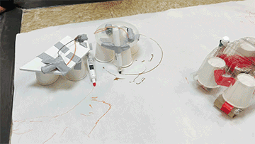 Materials: light-weight cups or containers, tape, small DC motors, batteries (1.5V-9V), markers, tape or other forms of adhesive, paper
